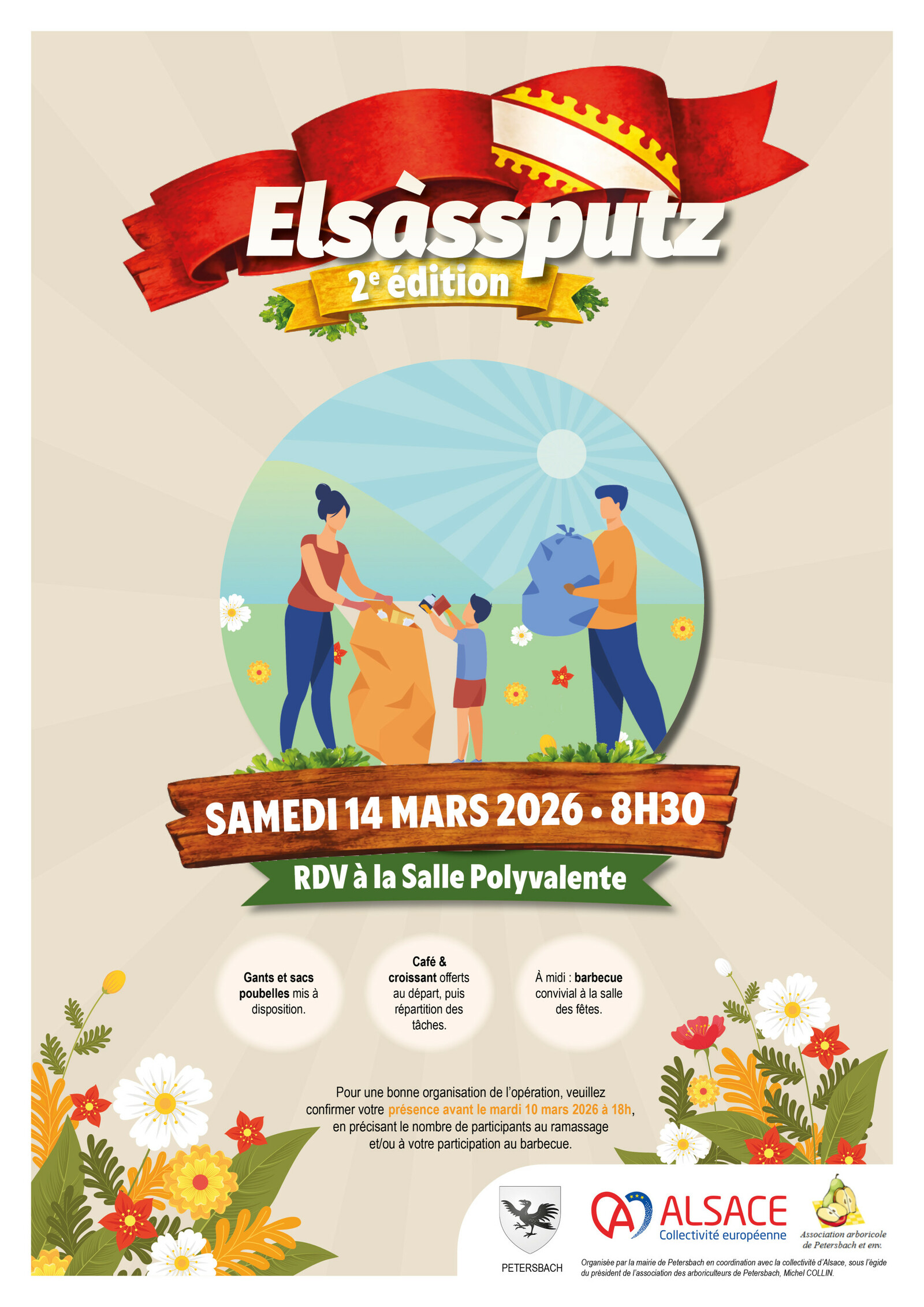 La mairie de Petersbach, en coordination avec la Collectivité d’Alsace et sous l’égide de Michel Collin, président de l’association des arboriculteurs de Petersbach, organise une grande matinée de nettoyage de printemps sur la commune.